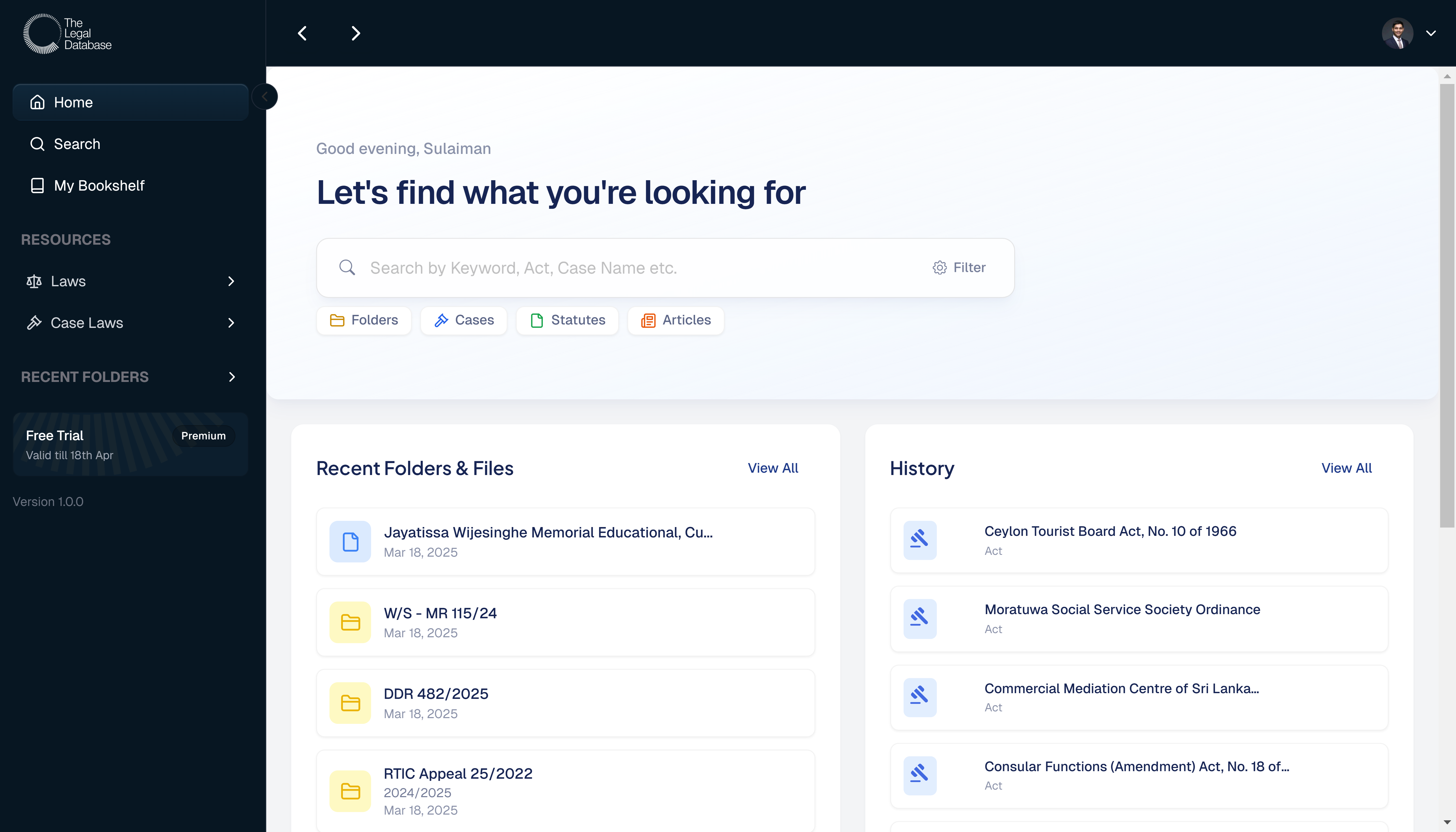 Comprehensive legal database containing laws, case laws, statutes, and legislations with a personal document management system. Processed over 500,000 pages of legal documents using AI and indexed for easy hybrid search.
